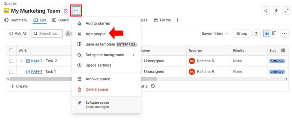 للتعاون مع أعضاء فريقك، يمكنك النقر على خيار Invite people ثم دعوة أعضاء فريقك للانضمام إلى Jira.