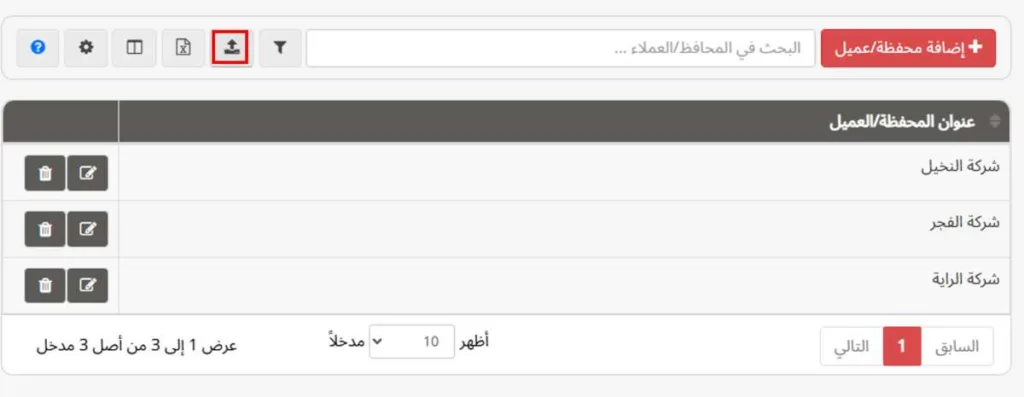 ولتعديل بيانات عميل، انقر على أيقونة التعديل الموجودة في نهاية صف العميل.