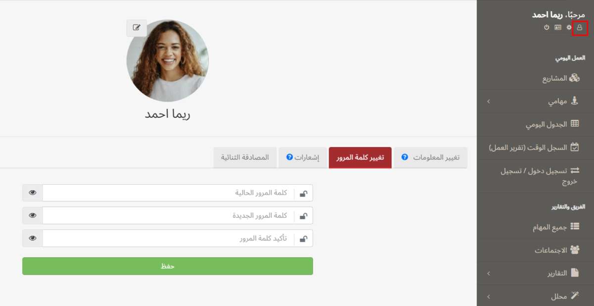 أسفل قسم الترحيب، يمكنك العثور على أيقونة صغيرة لعرض ملفك الشخصي. في هذا القسم، يمكنك تغيير معلوماتك الشخصية وكلمة المرور والموضوع.